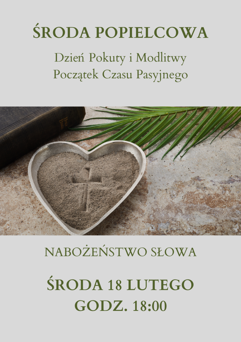 Już za tydzień rozpoczynamy Czas Pasyjny. Zapraszamy na nabożeństwo Słowa z okazji Środy Popielcowej, które odbędzie się w najbliższą środę 18 lutego o godz. 18:00.