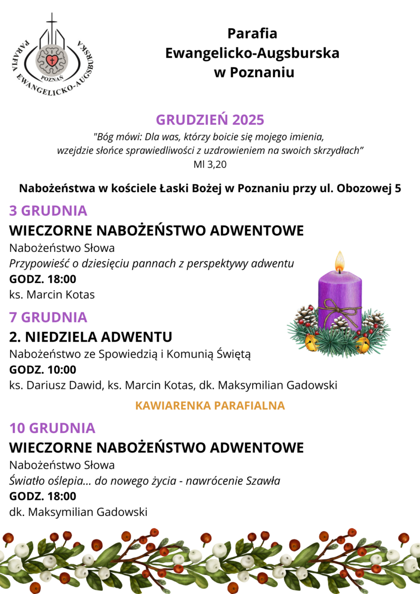 https://poznan.luteranie.pl/wp-content/themes/PEA-poznan/images/empty/thumbnail.jpg 150 150 Parafia Ewangelicko-Augsburska w Poznaniu Parafia Ewangelicko-Augsburska w Poznaniu https://poznan.luteranie.pl/wp-content/themes/PEA-poznan/images/empty/thumbnail.jpgBóg mówi: Dla was, którzy boicie się mojego imienia, wzejdzie słońce sprawiedliwości z uzdrowieniem na swoich skrzydłach. (Ml 3,20)